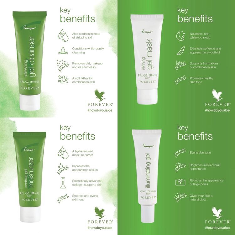 Sonya Daily Skin Care -suitable for combination and gentle enough for all ages.Scientifically advanced gel technology.It contains high concentration of aloe vera and other botanicals.